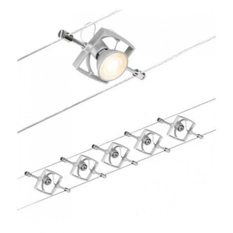 Set de base pour Mac II Paulmann 944.30-5xGU5,3-matt chrome-Set complet comprenant un transformateur, un câble, des projecteurs et une notice de montage -Les ampoules ne sont pas incluses dans le paquet. -Le kit de base peut être complété par des spots individuels, des déflecteurs et d’autres accessoires.-Le câble, d’une longueur de 10 m, peut être séparé au milieu de manière à ce que le système puisse être suspendu sur une distance maximale de 5 m.-Une seule prise est nécessaire pour distribuer les luminaires dans la pièce. Spécifications Espacement des fils 160 mmLargeur de la portée 5mLongueur 10 mDiminutif NoGu5.3 douillePuissance maximale 5×10 W, ampoules non inclusesNombre de composants 5 foisCouleur chrome mat Puissance du transformateur 60VATransformateur hauteur 47 mmTransformateur largeur 240 mmTransformateur profondeur 115 mm. ***