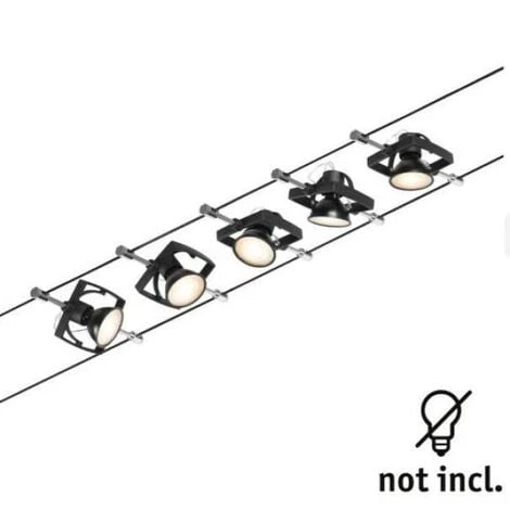 Mac II Set Paulmann 5xGU5,3 noir mat-chrome -944.34Set complet composé d’un transformateur, d’un câble, de spots et d’une notice d’installationPour montage au mur et au plafond.Ampoules non comprises.Le câble, d’une longueur de 10 m, peut être séparé au milieu de manière à pouvoir suspendre le système sur une distance maximale de 5 m.Une seule prise est nécessaire pour distribuer les luminaires dans la pièce. Les systèmes dotés d’une technologie à courant continu (12 V) ne peuvent pas être gradés à l’aide d’un gradateur mural. Spécifications Espacement des fils 160 mmLargeur de la baie 5 mLlongueur 10 mNon-allumableConnecteur GU5,3MWattage maximal 5×10 WC Couleur Chrome, Noir matMatériau PlastiquePuissance du transformateur 60 VAThauteur du transformateur 47 mmLargeur du transformateur 240 mmProfondeur du transformateur 115 mm. ***