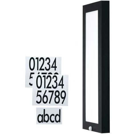 Type Numéro de maison LED avec détecteur de mouvement pour l’extérieur Indice de protection IP44 Tension 230V Type d’installation murale Acier inoxydable oui Interrupteur oui Durée de vie du produit 30.000h Lumière chaude 3000K Flux lumineux 1800lm Classe de protection II Matériau aluminium Couleur anthracite Dimensions 900x300x40mm. ***