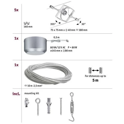 Les systèmes de câble s’adaptent à chaque pièce, qu’elle soit droite, mansardée ou avec de nombreux recoins. La série Mac II peut être montée au mur ou au plafond et offre ainsi des possibilités de conception illimitées. Personnalisable, le kit de base peut être complété avec des spots individuels, des renvois d’angles et autres accessoires. Veillez à respecter la capacité du transfo. Ce texte a été traduit par une machine.